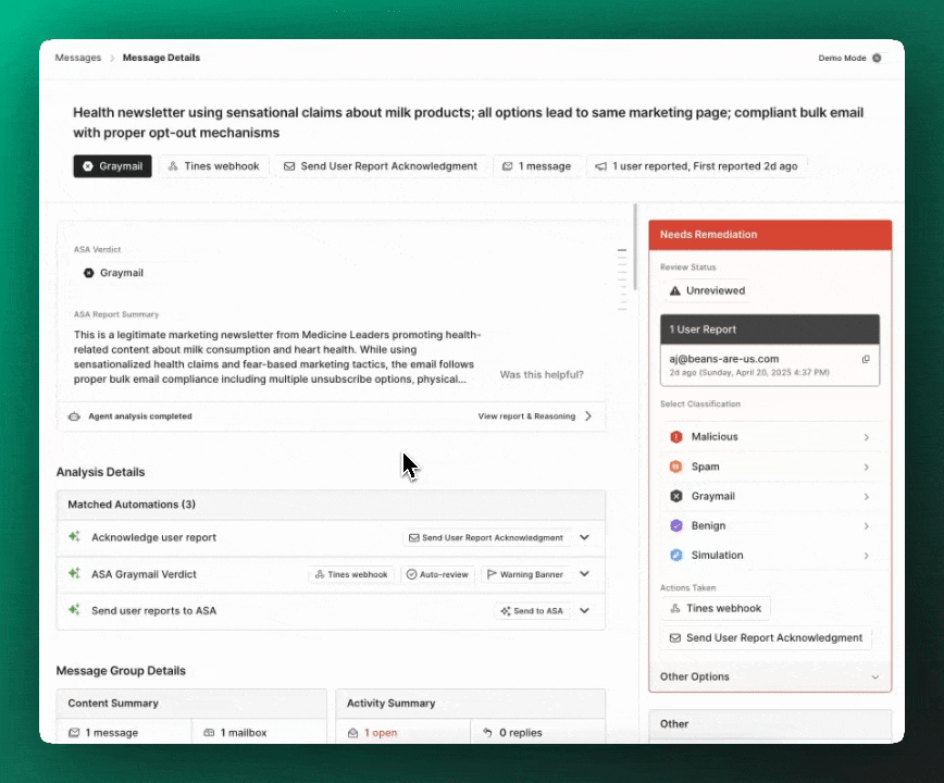 - Security teams maintain control over final remediation decisions and message classifications while reaping the benefits of ASA’s analysis.
