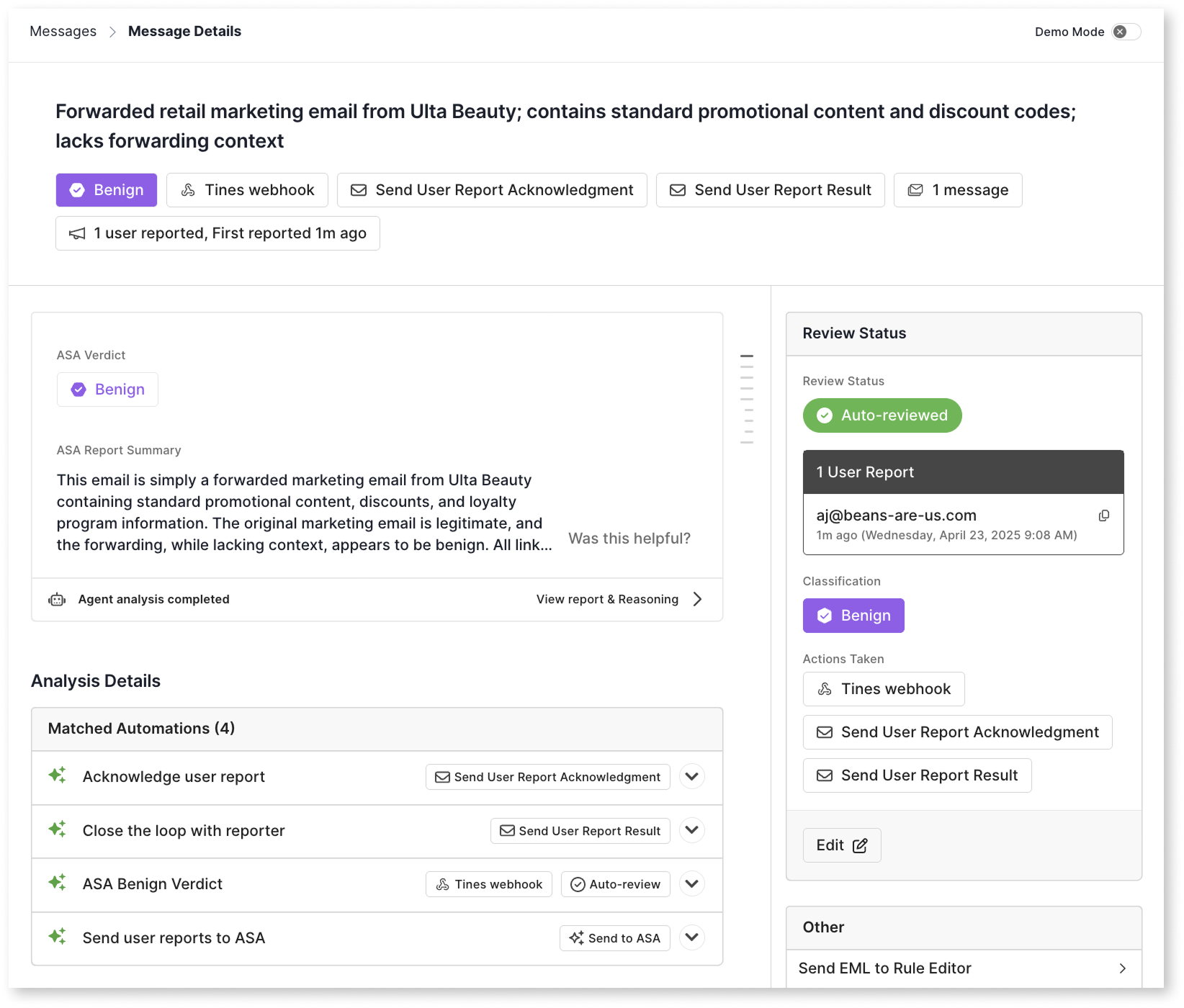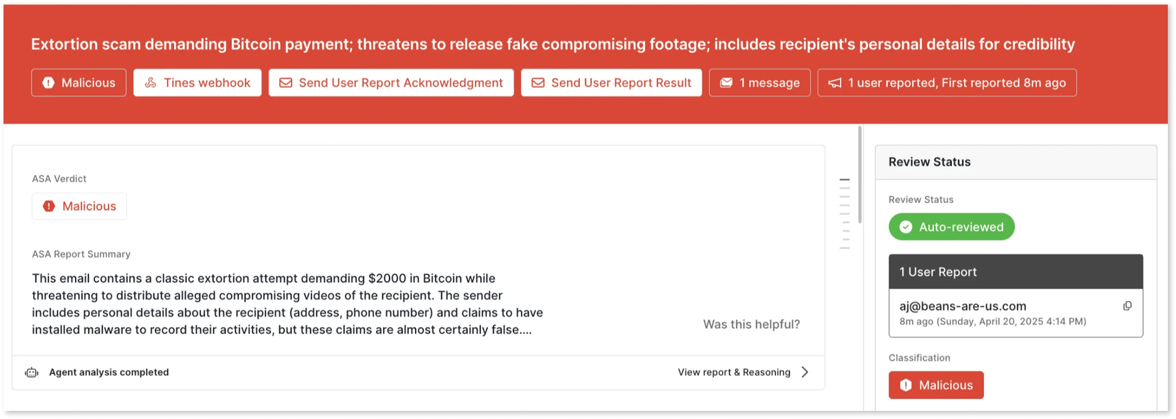 When enabled, ASA is invoked automatically after an end-user reports a message as an Automation with the trigger “user report received”. After being invoked, ASA completes analysis and comes up with a verdict for the message along with a full report.