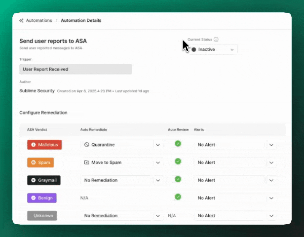 activestate, the ASA Automation will analyze, triage, and remediate user reported messages. - You can adjust the auto-remediations, auto-review status, and custom alerts for individual ASA verdicts to give ASA as much or as little autonomy as you’d like!