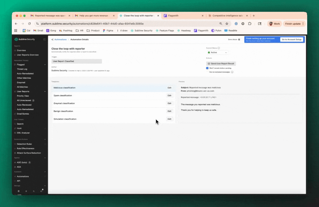 With Sublime's automatic responses to user reports, Microsoft365 and Google Workspace users can automatically interact with and give feedback to reporting end-users: