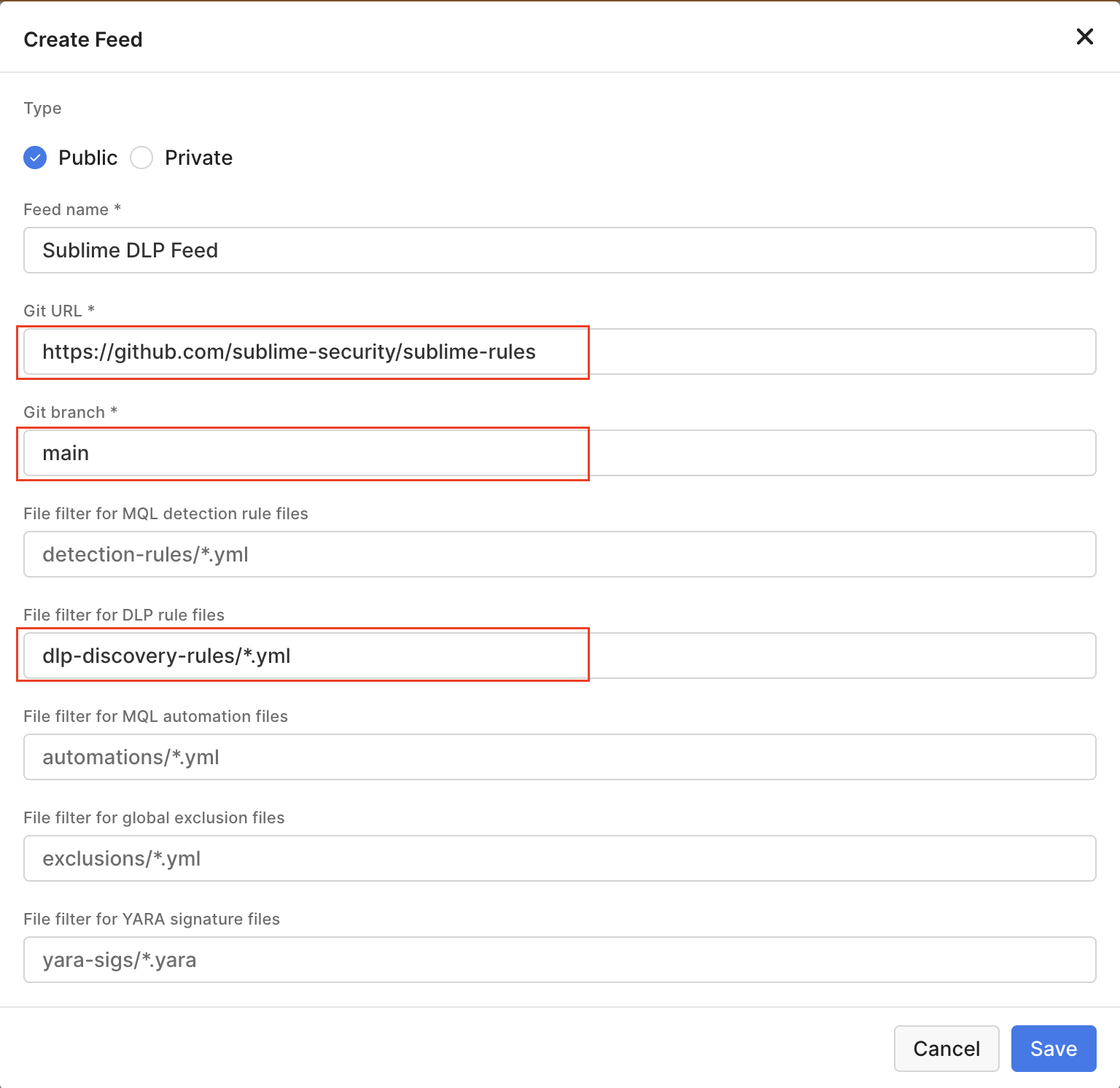 You can write any number of DLP Rules in addition to the Sublime DLP Rule Feed that's available for installation. To set up the DLP Feed, you'll want to fill in the Feed parameters as follows: