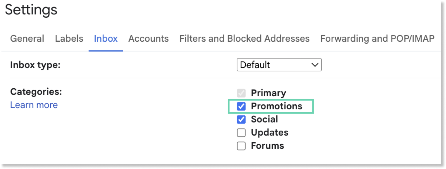 - Inbox Categories are enabled by default for Google Workspace mailboxes. The setting is available in Inbox > Categories. We recommend keeping the Inbox Promotions Category (highlighted below) enabled in order to keep graymail out of sight for mailboxes!