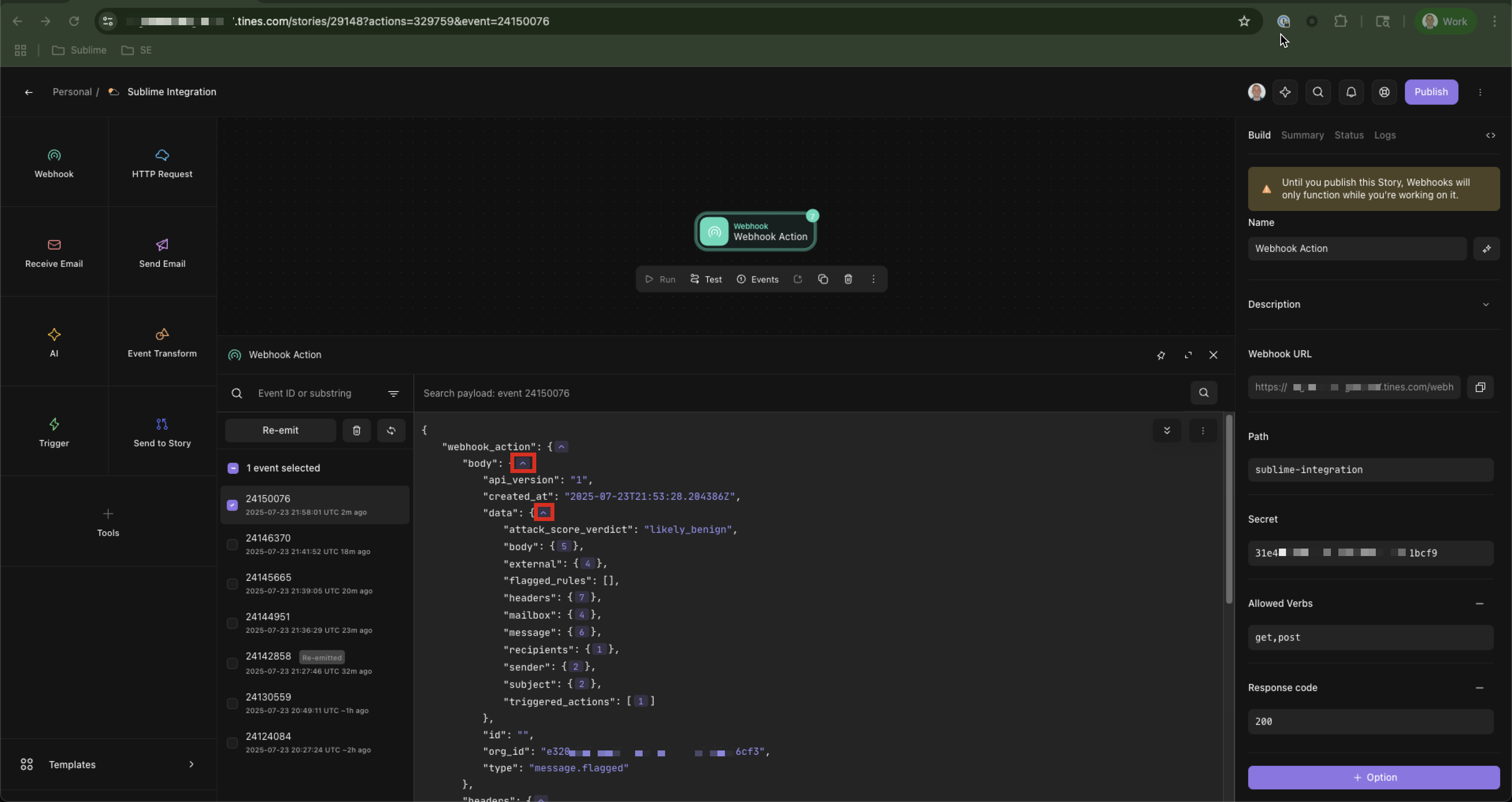with the auth details of the Tines Webhook. We can easily choose what datapoints we want to pass from Sublime to Tines as well.