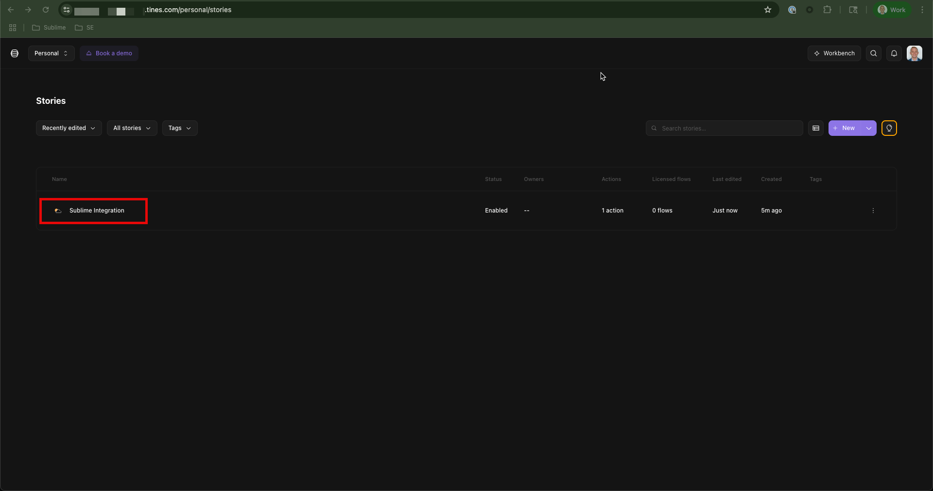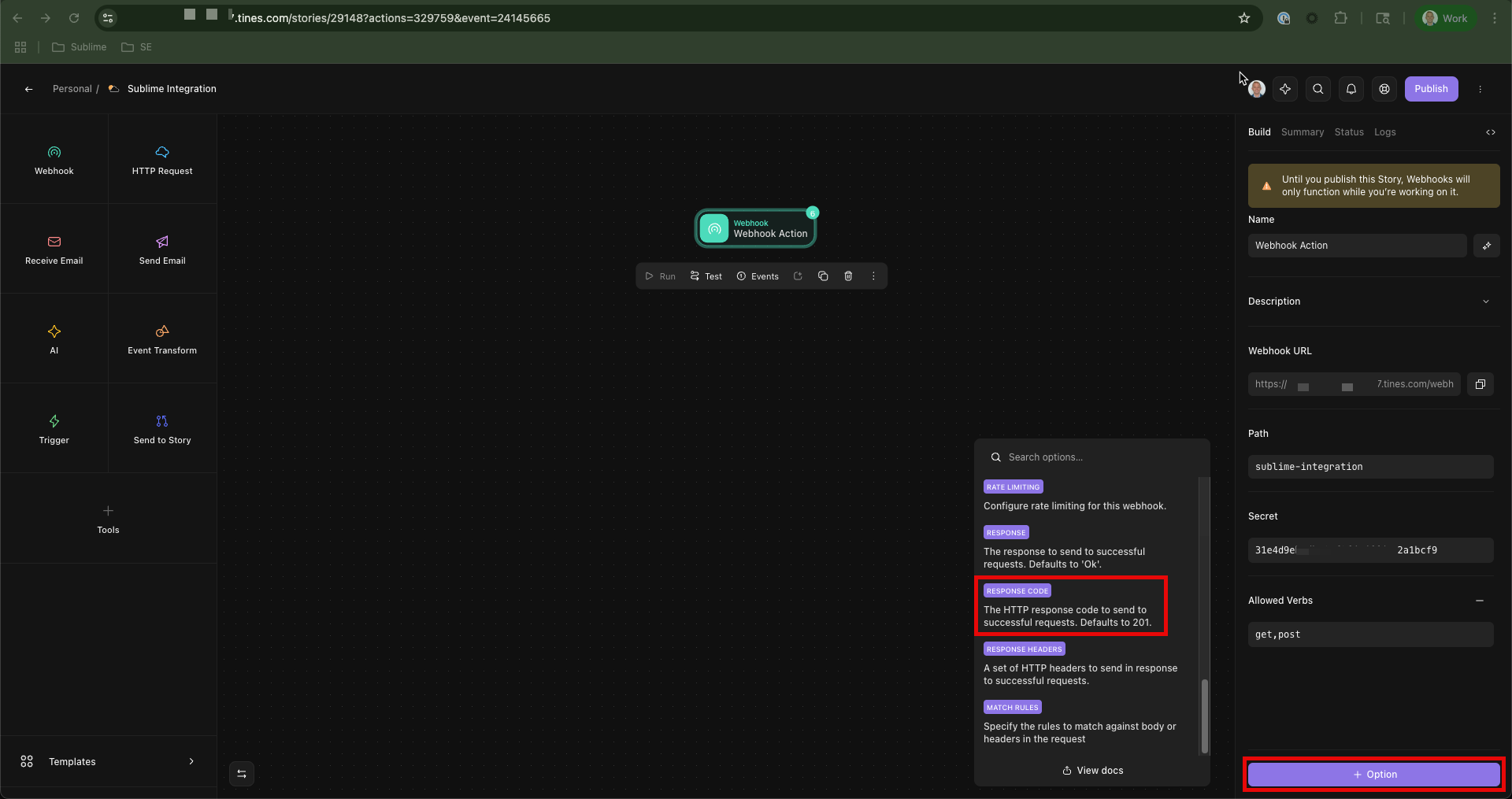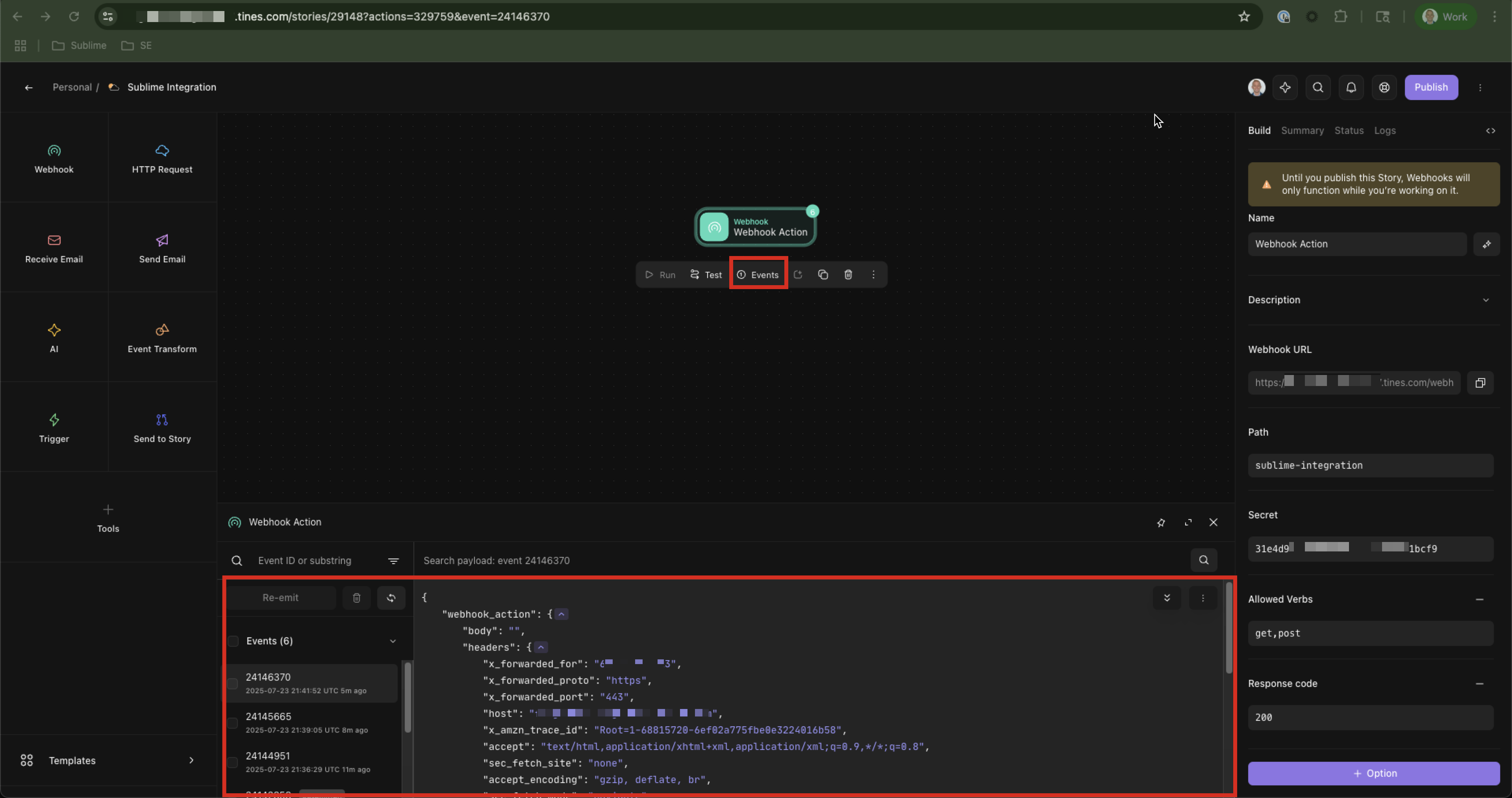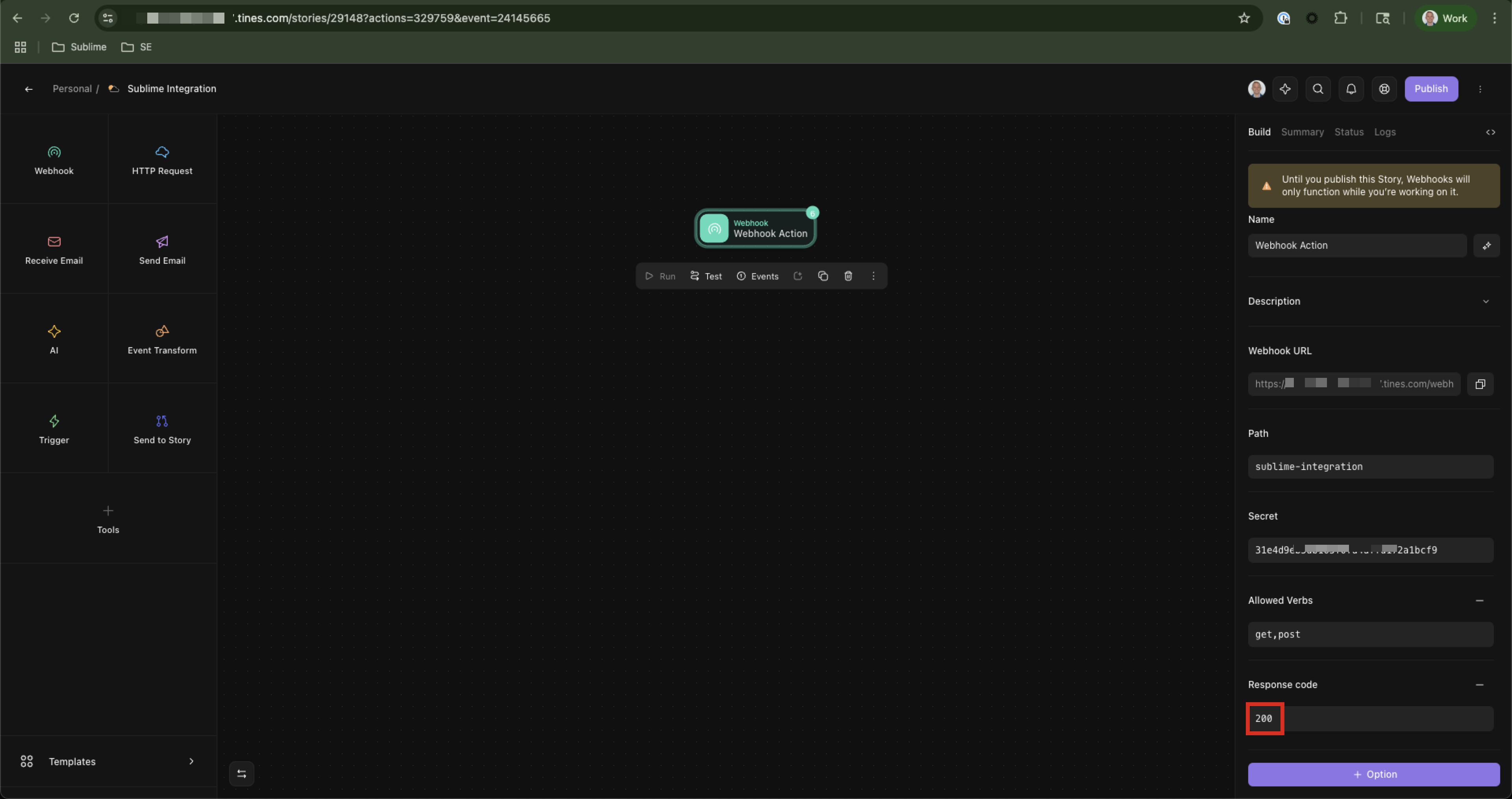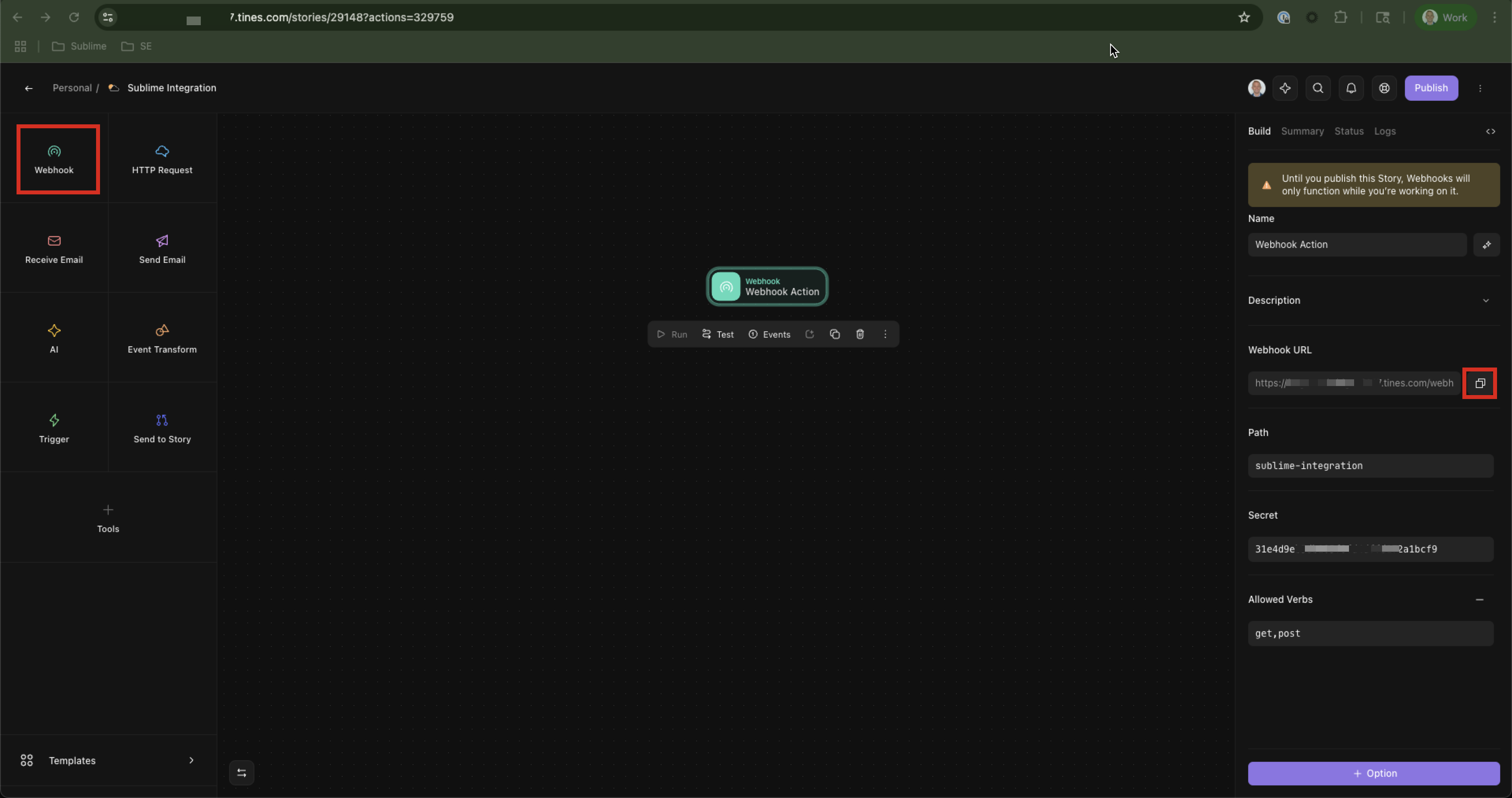 - Navigate to the Tines console and open up the story you would like to add the Sublime Webhook action to