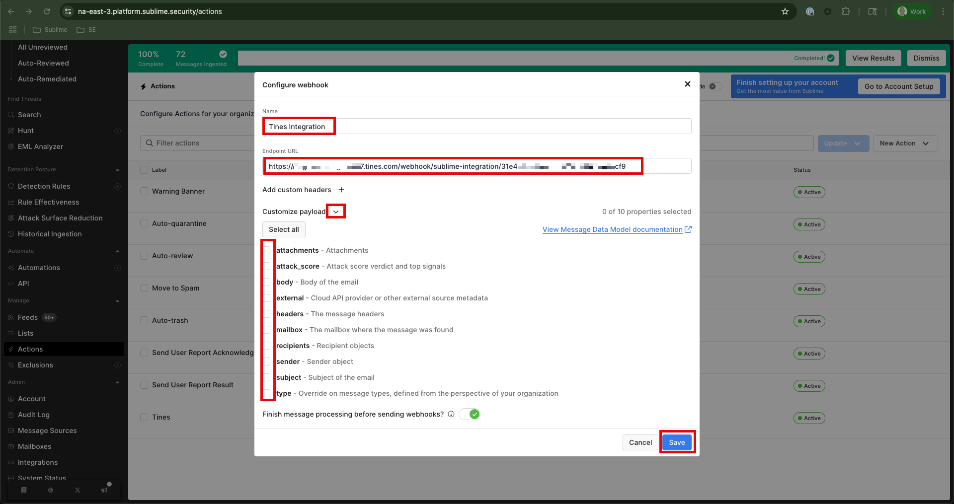 , paste the webhook URL from the Tines setup step 2 above intoEndpoint URL