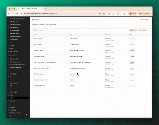 - Click the "Actions" dropdown and select your Warning Banner Action